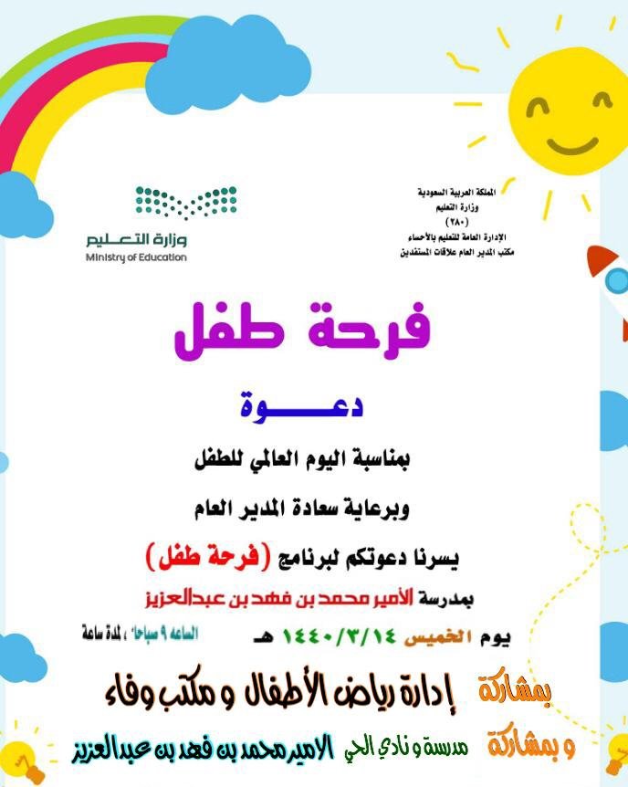 نادي الحي بمدرسة الأمير محمد بن فهد بن عبدالعزيز On Twitter برعاية مدير عام التعليم الأستاذ أحمد بالغنيم يسرنا دعوتكم غدا الخميس 14 ربيع أول لحضور برنامج فرحة طفل بمدرسة ونادي