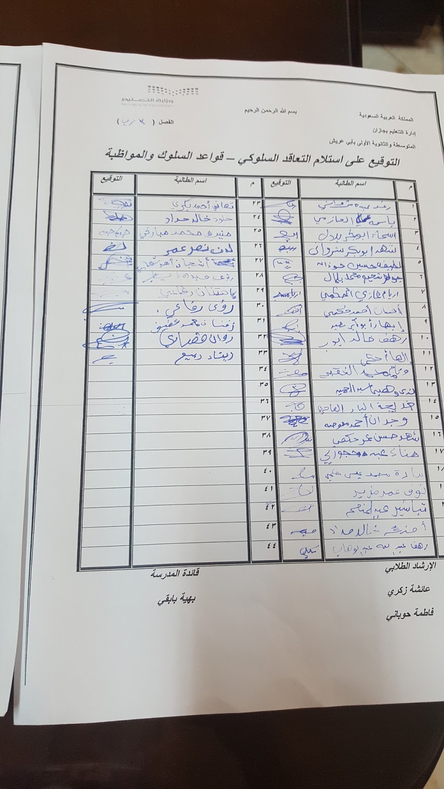 المرشدة الطلابية أ فاطمة حوباني شرح قواعد السلوك والمواظبة لطالبات المتوسطة الأولى بأبي عريش