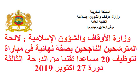وزارة الأوقاف والشؤون الإسلامية لائحة المترشحين الناجحين بصفة نهائية في مباراة لتوظيف 20 مساعدا تقنيا من الدرجة الثالثة دورة 27 اكتوبر 2019 الوظيفة بالمغرب