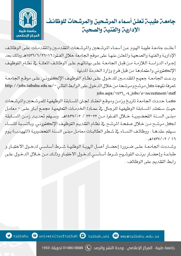 Uzivatel جامعة طيبة Taibah U Na Twitteru وظائف جامعة طيبة تعلن عن توفر وظائف أكاديمية شاغرة للتقديم و الاطلاع على التخصصات المتاحة Https T Co 2kjhjkcjzj Https T Co 9qpozpm6hz