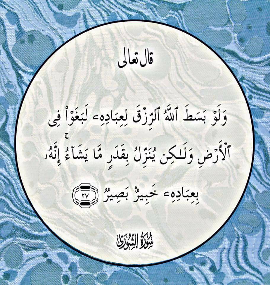 البطاقة الإسلامية Twitterren ولو بسط الله الرزق لعباده فوس عه عليهم لبغوا في الأرض أش ر ا وبطر ا ولطغى بعضهم على بعض ولكن الله ينزل أرزاقهم بقدر ما يشاء لكفايتهم إنه بعباده خبير بما يصلحهم