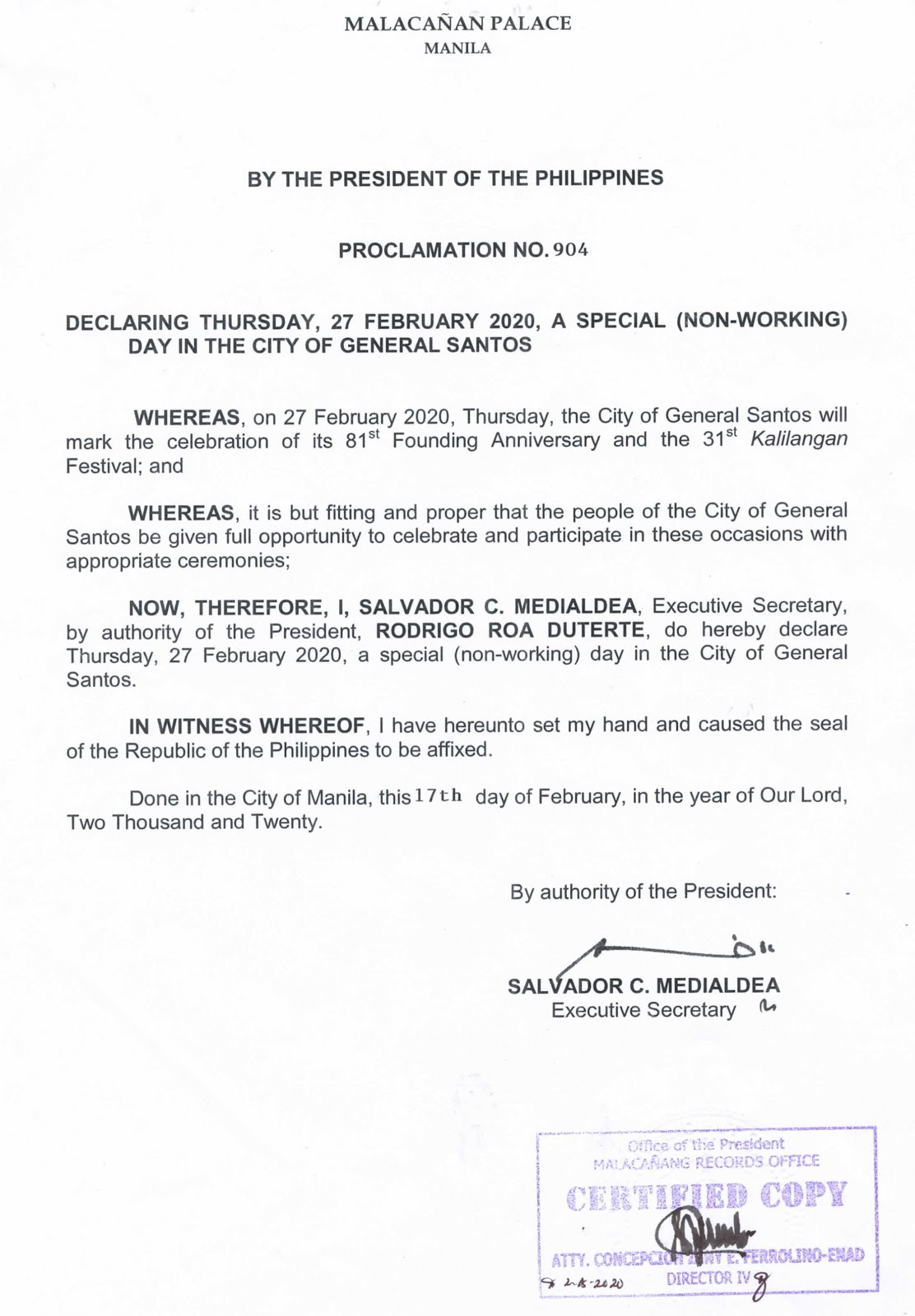 Philippine Holidays Special Non Working Day In General Santos City On February 27 2020 Proclamation No 904 S 2020