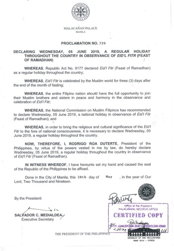 Walangpasok Malacanang Declares August 12 Regular Holiday For Eid Al Adha 2019 Out Of Town Blog